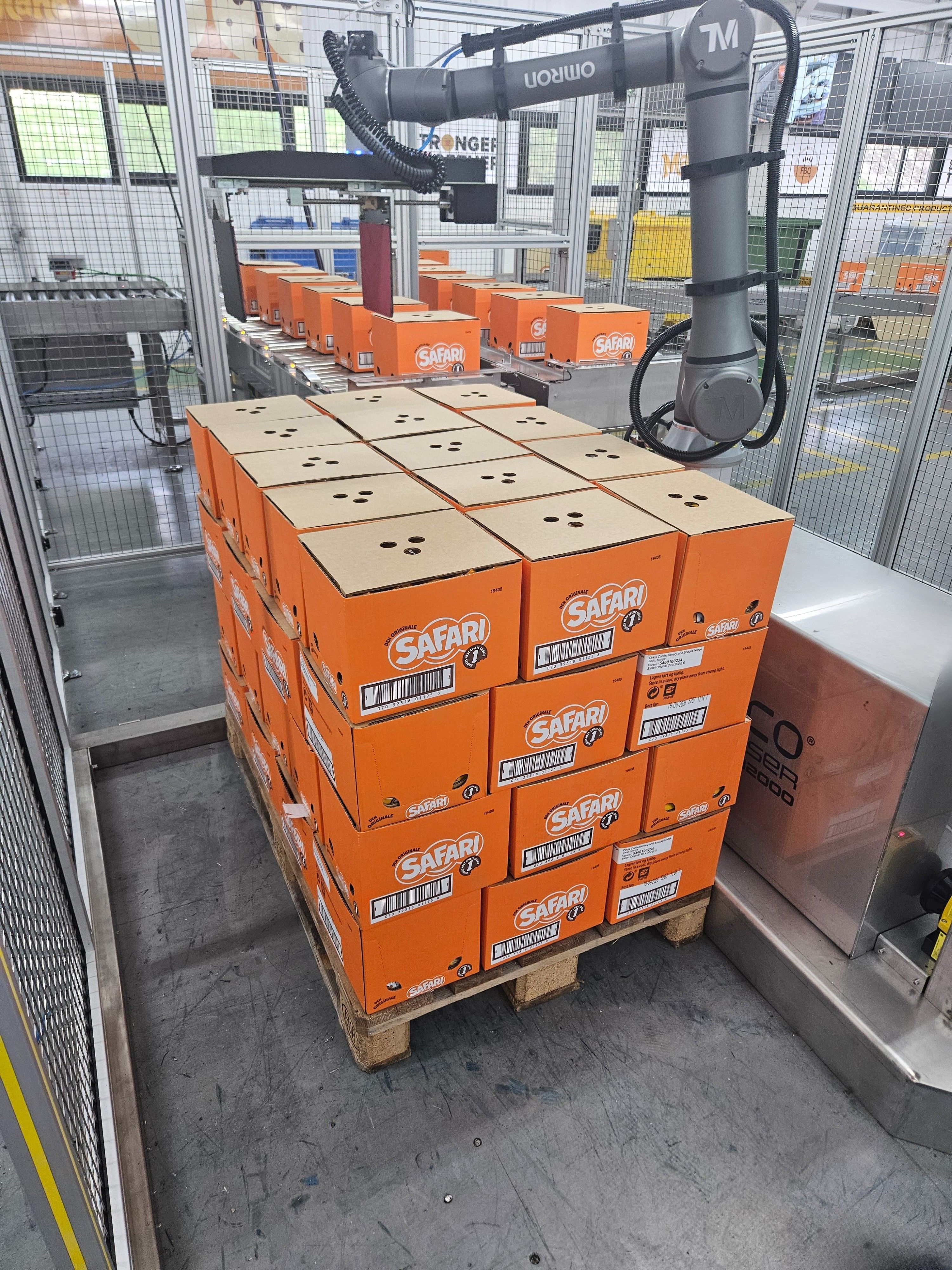 Following a thorough assessment of the existing setup, which comprised three conveyors feeding into the packing hall and two redundant robots, Reeco implemented a smart conveying solution integrated with four RB2000 palletising systems.